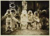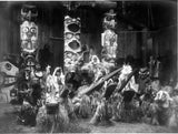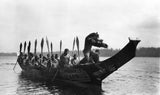 In 1911, as part of his massive undertaking, famed Northwest photographer Edward S. Curtis travelled to Vancouver Island, British Columbia, to visit the Kwakwaka'wakw. By the next year, needing money for his project and to add to his research and still photography work, Curtis decided that the best way to record the traditional way of life and ceremonies of the Kwakwaka'wakw was to make one of the first feature motion pictures. Curtis had already shot footage in 1906 of the Hopi Snake dance, which he had previously showed during his talks, but this was to be on a grander scale. It took three years of preparation for this one film including the weaving of the costumes; building of the war canoes, housefronts, poles; and the carving of masks. Assisting on the film was George Hunt, a Kwakwaka'wakw who had served as an interpreter for the famous anthropologist Franz Boas nearly twenty years before. Hunt helped contribute substantial portions of the film’s story as well.
